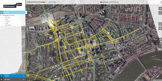 A team of Witteveen+Bos data and mobility experts developed the LoopMonitor in collaboration with the Municipality of Rotterdam. This data-driven analysis platform provides insight into pedestrians and the pedestrian network, allowing cities and developers to design for and actively prioritise this sustainable, efficient and active mode of transport. The Pedestrian Traffic Monitor provides information per neighbourhood or city and displays the level of intensity, capacity and quality for pedestrians at street level.