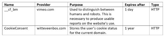 Witteveen+Bos mag deze cookieverklaring aanpassen, bijvoorbeeld omdat onze websites of de regels rond cookies wijzigen. Je kunt de actuele versie van deze cookieverklaring raadplegen door onderaan elke pagina te klikken op de link cookieverklaring. Deze cookieverklaring is voor het laatst aangepast op 11 juli 2022.