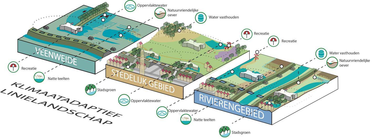 Het doel van de Provincie Utrecht is om het open en groene waterlinielandschap een functie te geven in de urgente opgave van klimaatadaptatie. In dit project hebben wij onderzocht hoe we de Hollandse Waterlinies opnieuw kunnen inzetten om ons land te beschermen, maar dan tegen klimaatverandering. De eerste stap hierin was het identificeren van klimaatkansen binnen het waterlinielandschap. Deze klimaatkansen zijn uitgewerkt in een klimaatkansenkaart en bieden een opstap naar een klimaatrobuust linielandschap.