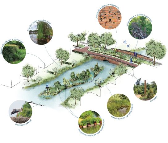 Witteveen+Bos has been the central figure in converting the ambitions of the Convenant Klimaatadaptief Bouwen – a collection of agreements on climate-adaptive construction – into practical area development. ‘The principles of the Convenant were made concrete using a funnel method, and the underlying water-and-greenery structure was fully integrated into the zoning plan. This was done in observance of policy rules and environmental impact assessment obligations, with a matrix of nature-inclusive measures providing – and continuing to provide – important guidance for making choices.’