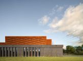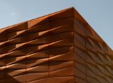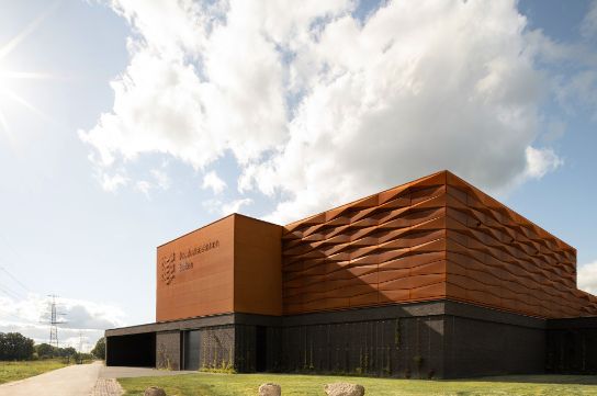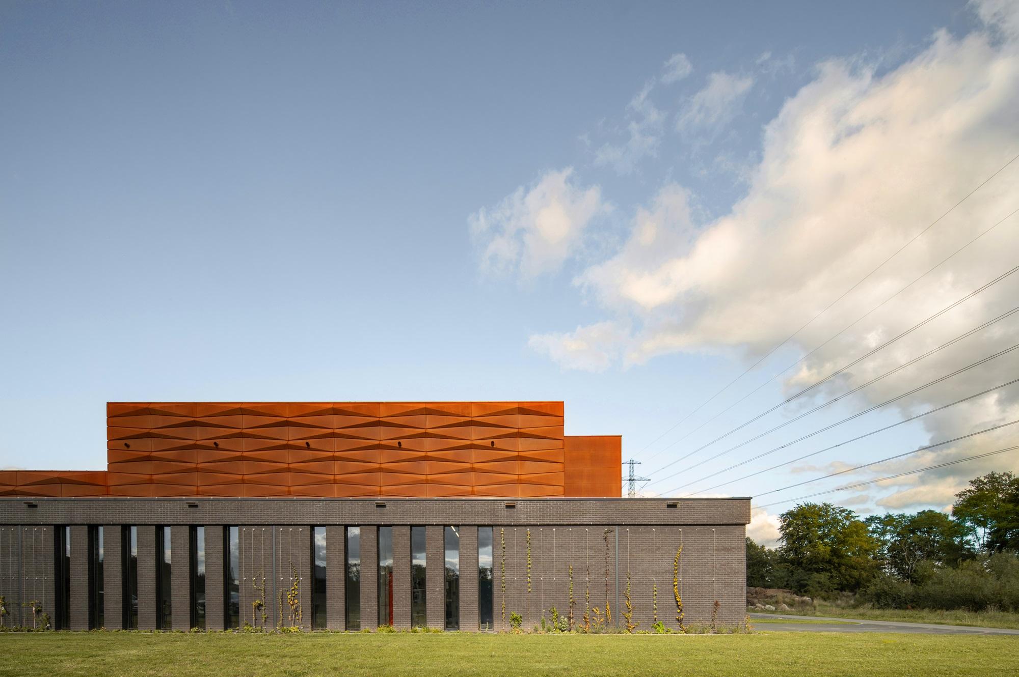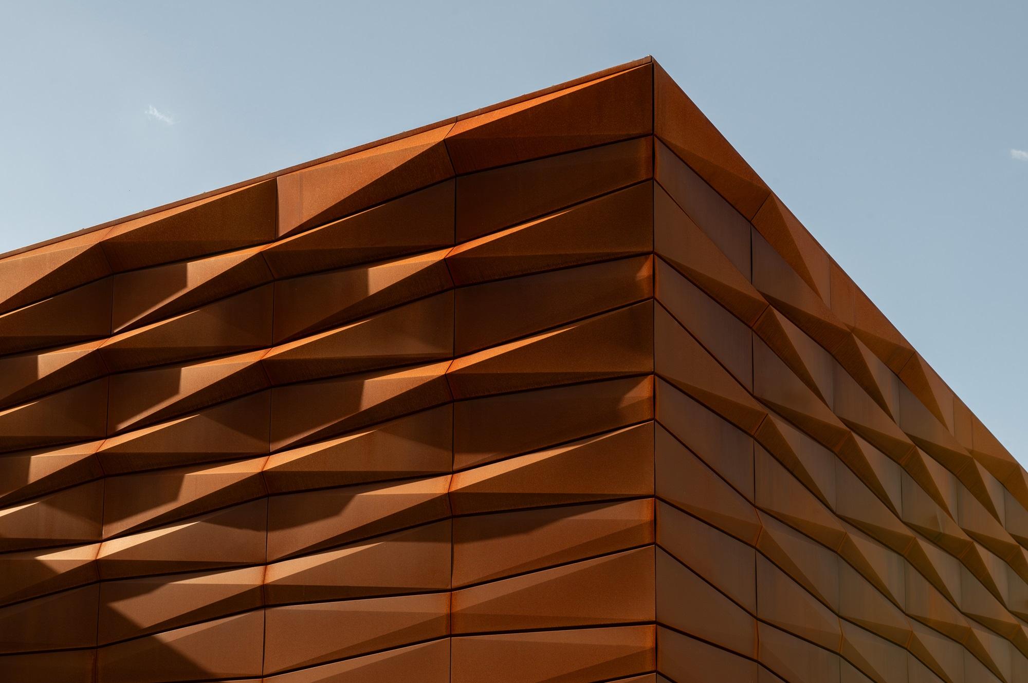 The weathering steel sculpture and the green façades simultaneously refer to the two historical landscapes of area: the higher lying fields of the Beiler Es with variable tones of reddish brown and the lower lying green river valley. The 3D pattern of the weathering steel façade panels also depicts the relief of a water surface.
