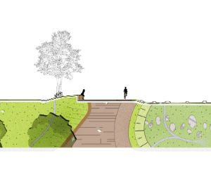 The roofs of the surrounding buildings will also be disconnected from the sewer system. Rainwater will be channelled to the central wadi via surface flows. The wadi specifically serves a double function: for water storage to unburden the sewer system during peak downpours, and it also serves as an aesthetic, spatial and recreative element. For example, this is reflected in the inclusion of a stone walking path in the design. In addition to the Multifunctional Design principle, the Nature-based Design principle also has prominence. In part because the rainwater is slowly infiltrated into the soil due to the landscaped gully.
