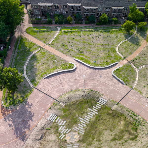 The Circular Design principle is about making choices for current and future lifecycles, and closing chains by using resources, materials, residual products and waste streams in the design as circular raw materials. By carefully considering the natural aspects of the surroundings, particularly relating to rainwater discharge, and by integrating these aspects into the design, it became possible to capture thousands of litres of water and to use this water in the environment.