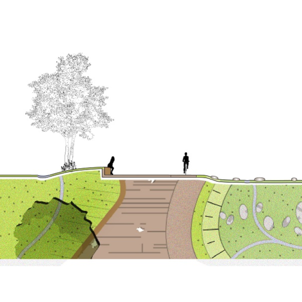 The roofs of the surrounding buildings will also be disconnected from the sewer system. Rainwater will be channelled to the central wadi via surface flows. The wadi specifically serves a double function: for water storage to unburden the sewer system during peak downpours, and it also serves as an aesthetic, spatial and recreative element. For example, this is reflected in the inclusion of a stone walking path in the design. In addition to the Multifunctional Design principle, the Nature-based Design principle also has prominence. In part because the rainwater is slowly infiltrated into the soil due to the landscaped gully.
