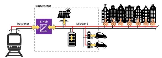 Large portions of the public transport system, such as railways, the tram networks of The Hague, Rotterdam, Amsterdam and Utrecht, and the trolley buses in Arnhem, have their own electricity grids called ‘traction networks’. These networks are far from using all their capacity at all times of the day. Integrating traction networks with charging infrastructure, solar power and energy storage can improve energy exchange and promote the energy transition in urban areas. The development of innovative and scalable direct-current energy hubs (DC eHubs) has a role to play.