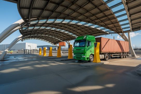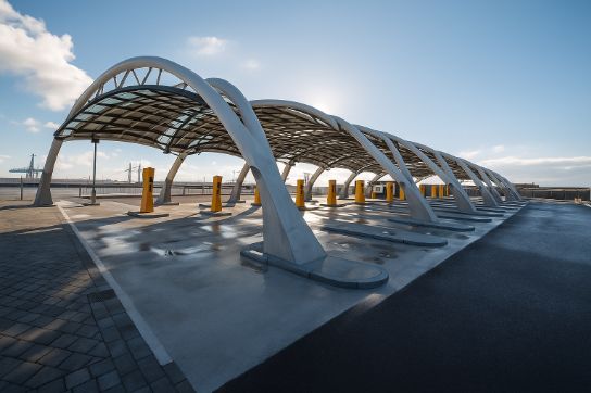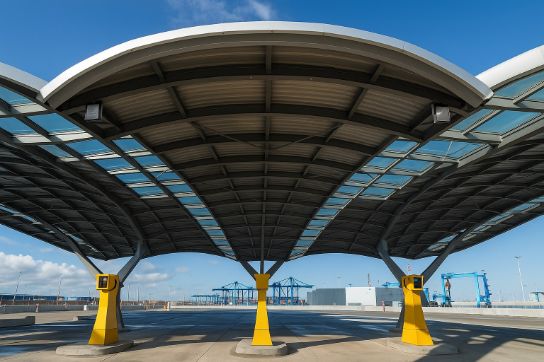 The entrance building, the ‘gate canopy’, forms the gateway for freight traffic to APM Terminals' new container terminal. From here, container transport to and from the hinterland is handled, with drivers receiving route instructions via electronic columns. The canopy consists of steel arches with a double-curved roof surface. This element largely determines the appearance of the terminal.