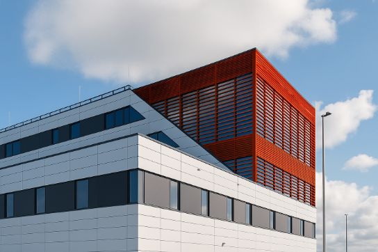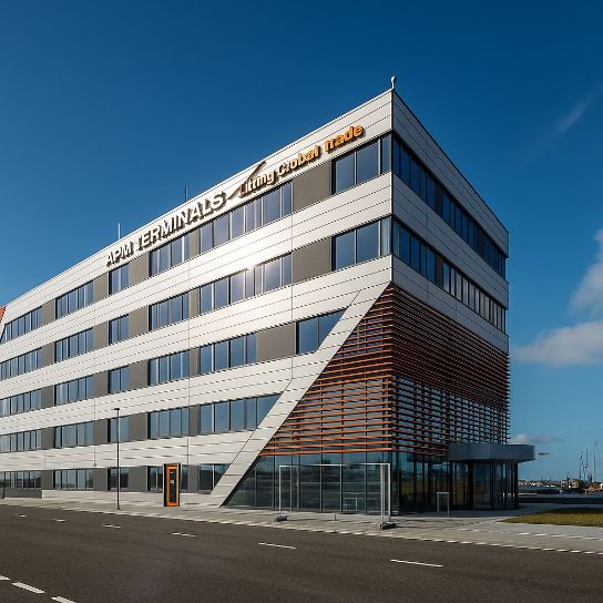 The port and industrial landscape has its own beauty with a pure appearance. This is thanks to the clean appearance of technology without frills. In this context, the office building has been designed to be functional and efficient. The office building, from which the cranes are controlled, covers 5,000 m² GFA and contains offices, a data centre and a control room. The entrance and control room are strikingly marked with red slats. The office floors with horizontal window strips form a solid base and are reminiscent of the contours of a ship.