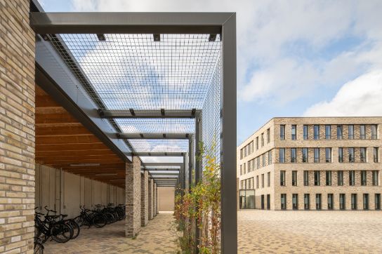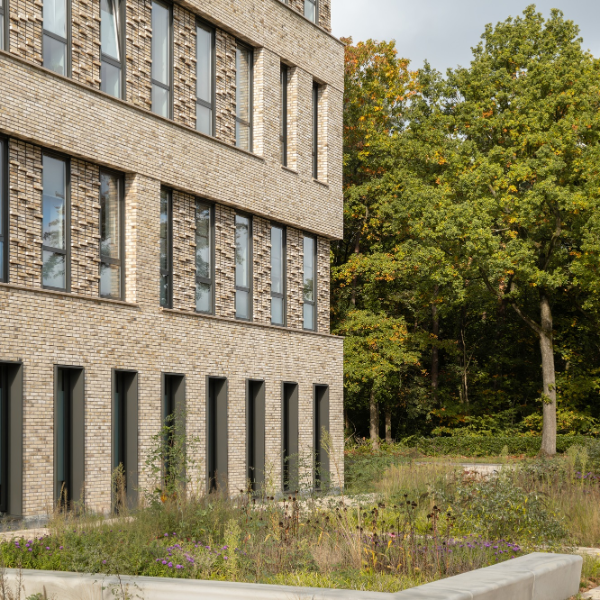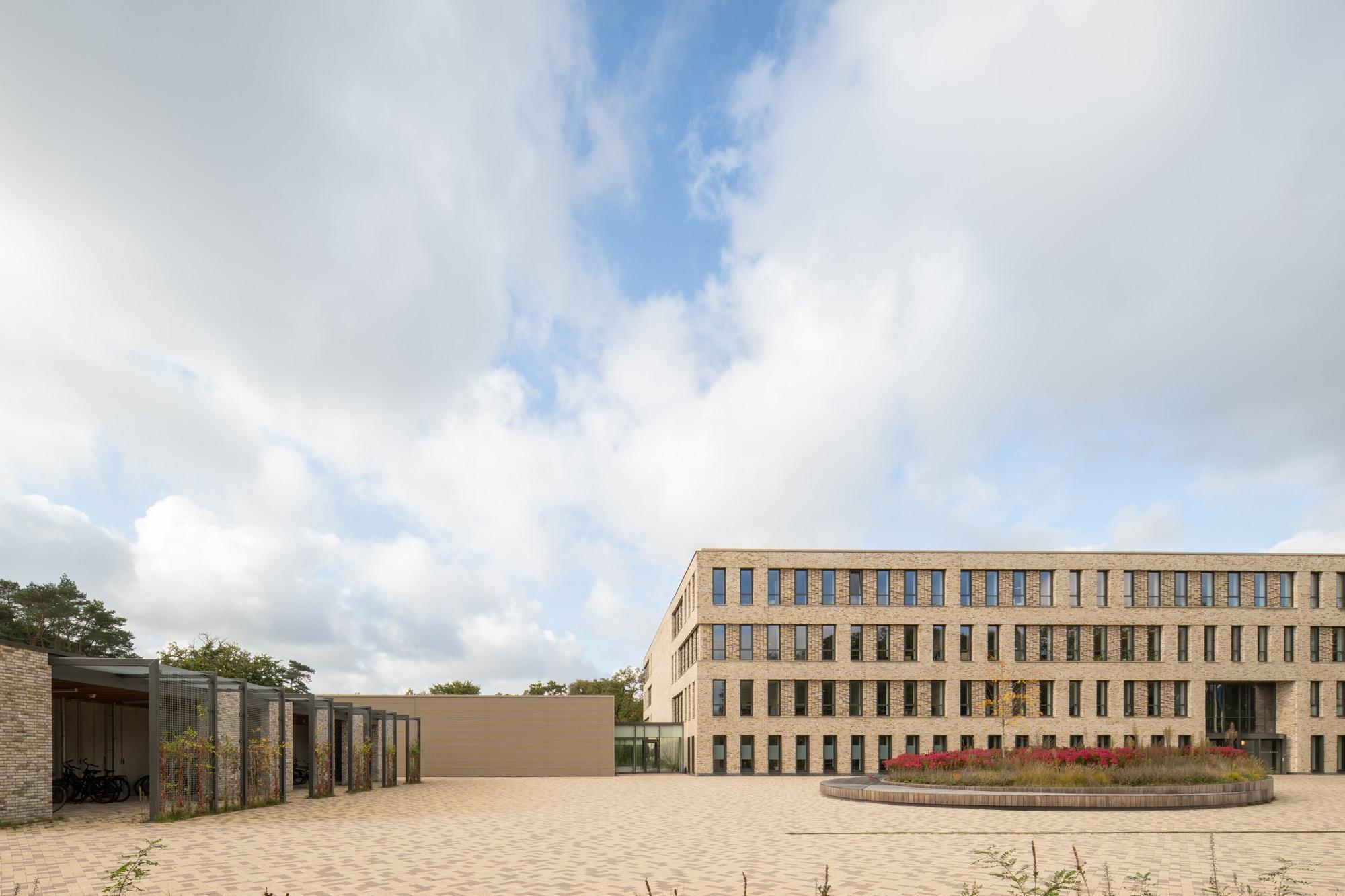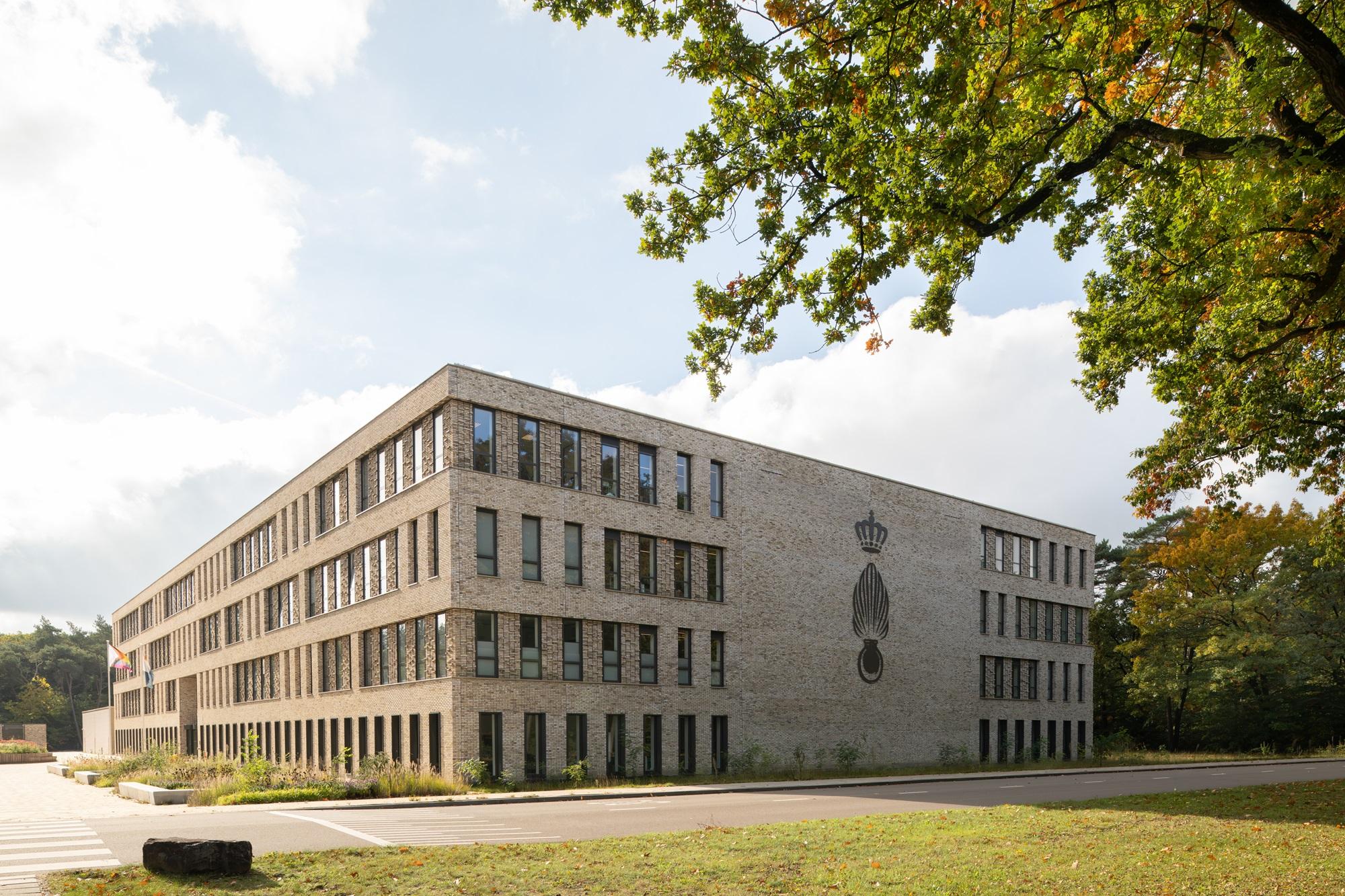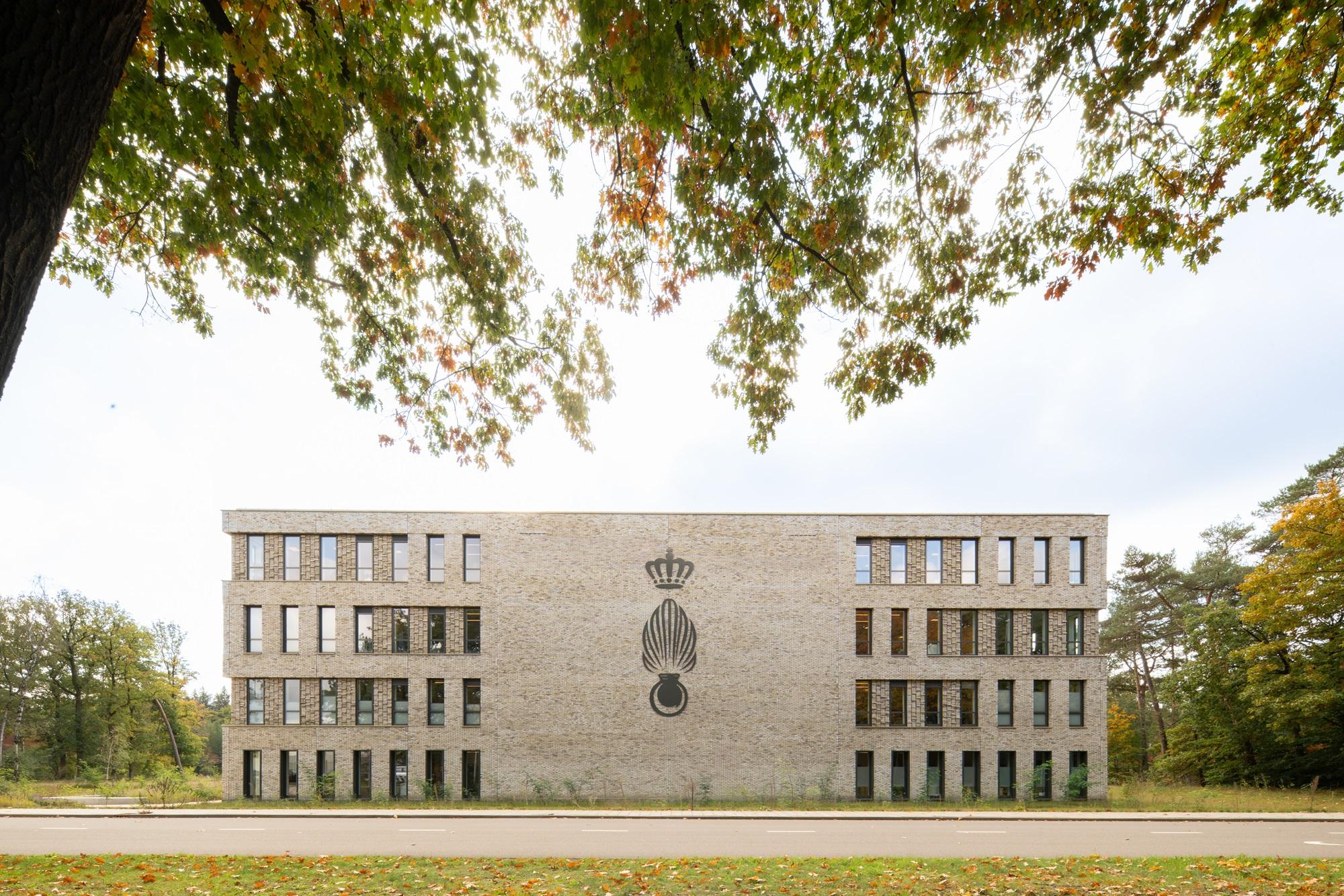 Up close, nuances in brickwork patterns and offsets are clearly visible in distinctive details. From a distance, the recessed glass entrance façade is prominent and accentuates the central axis of the building. The mixed brick façades refer to the forests and nearby sand drifts of Soesterduinen, but also to the camouflage patterns of the military: sturdy and full of character.