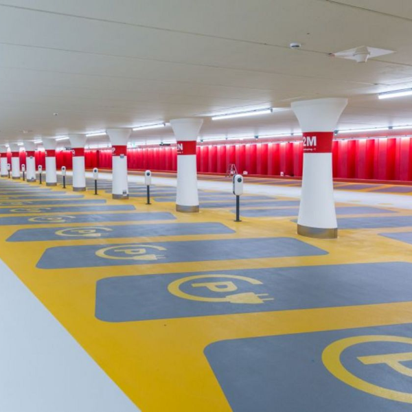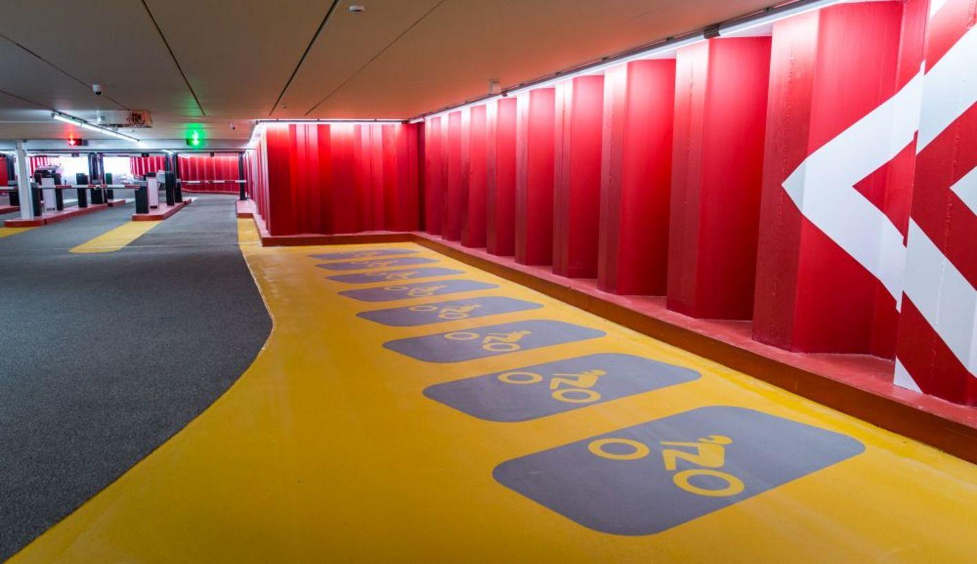 A great deal of attention has also been paid to the aesthetic aspect. The ceiling of the car park is completely flat because all structural beams, air ducts and lighting cables have been skilfully concealed. This creates a calm, high-quality appearance and prevents visual noise. As a result, visitors' attention is focused entirely on the clear signage and inviting entrances, which contributes to a positive parking experience.