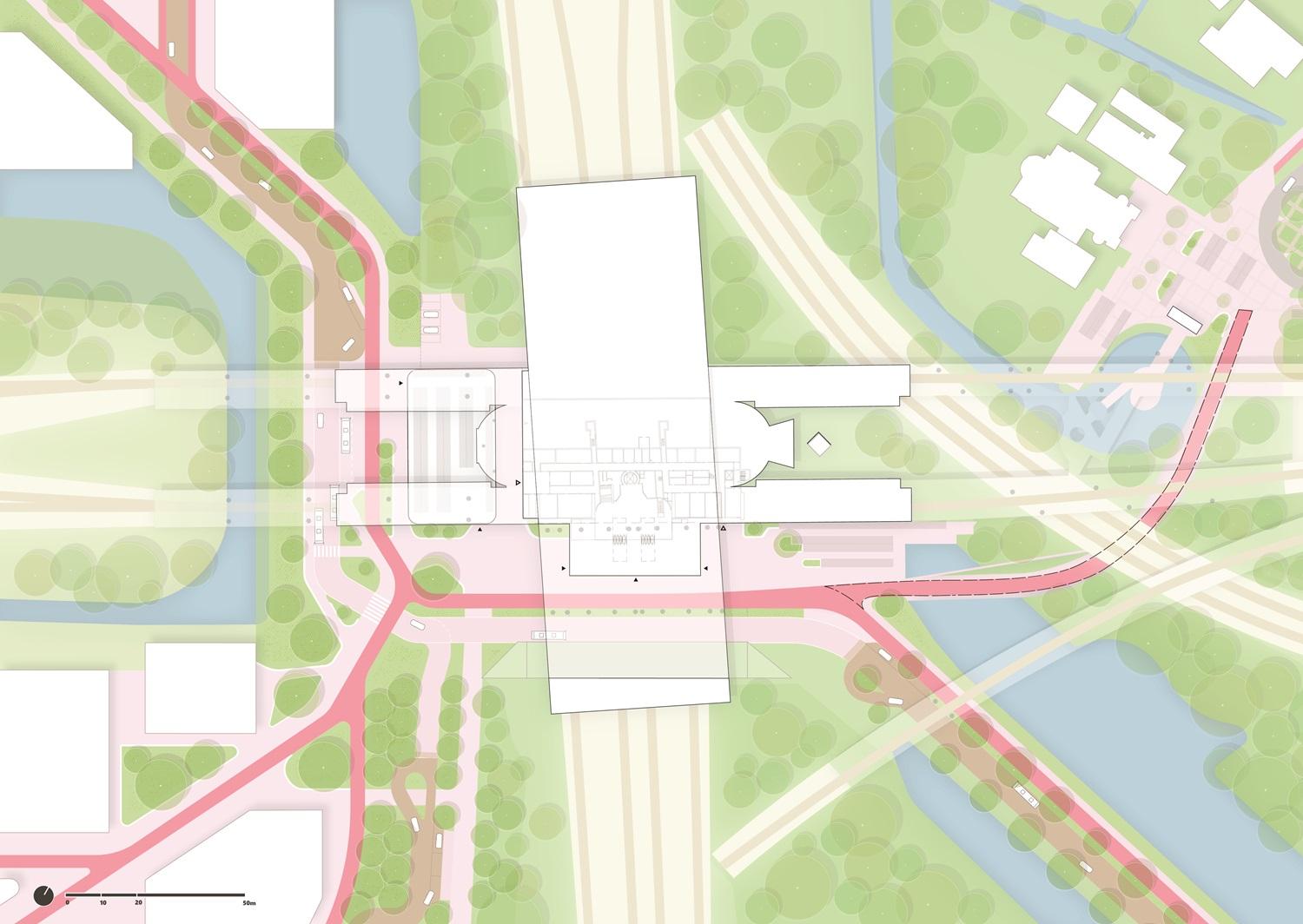 Strategically placed trees, green sightlines and clear landmarks make the station a green oasis and a pleasant transfer point in an urbanised environment. By robustly connecting the currently separate green wedges, eco-passages are created that provide living space for many animal species. This combination creates an attractive entrance at ground level, facilitates many ´walkers and cyclists´ in ´De Nieuwe Kern´ and stimulates biodiversity.