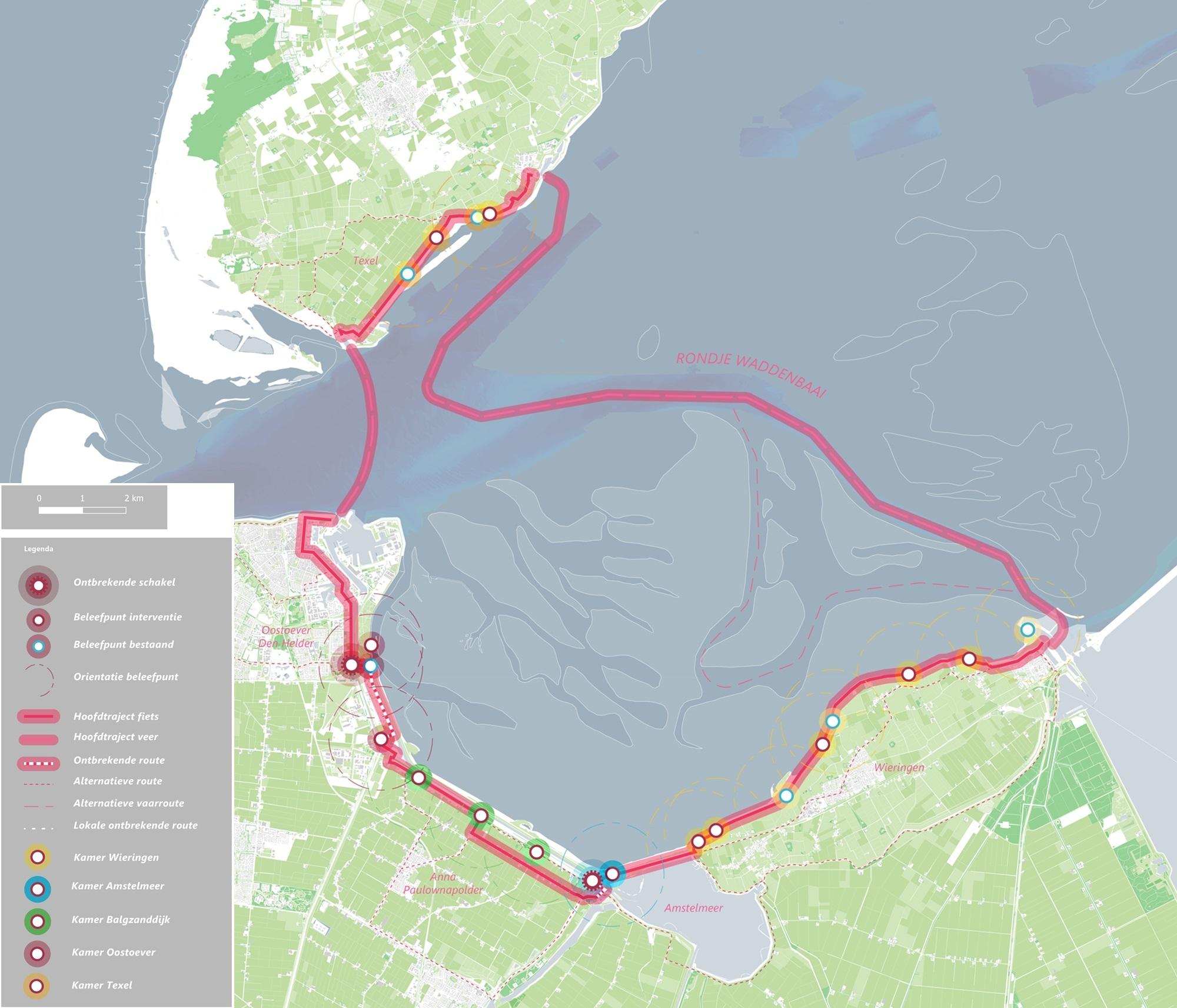 An important starting point on the way to a continuous route is to analyse the smaller local cycle routes and loops. A series of missing links have been added and new points of interest have been incorporated. The result is a continuous route: the ‘Waddenbaai’ loop, including a proposal for a new foot and bicycle ferry from Den Oever to Oudeschild (Texel).